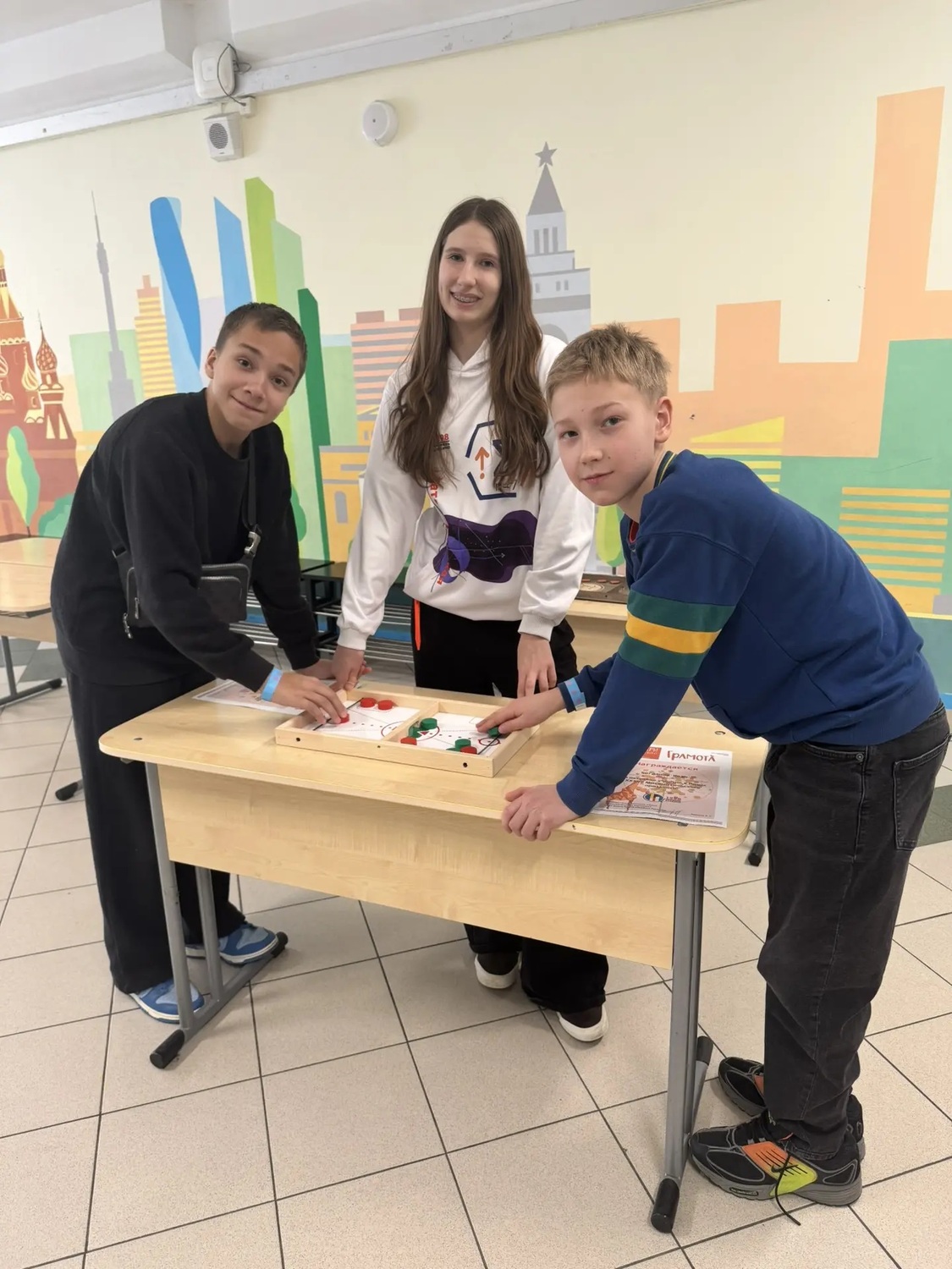 - Далее параллельно прошли два этапа - "Своя игра" и "Битва капитанов". Капитаны зарабатывали очки команде, решая персональные задачки, не участвуя в "Своей игре". В это время ребята выбирали вопросы по изучаемым в школе курсам (алгебра, геометрия, вероятность и статистика, математическая логика).